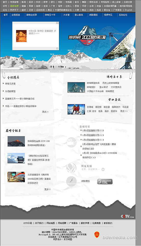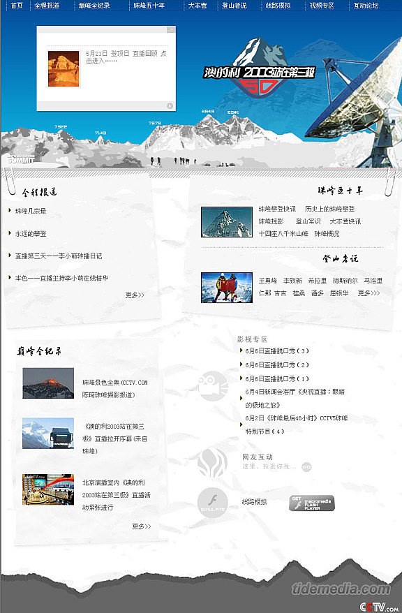 这是一个电视与网络互动的主题,网站要满足活动的网上报道、网友互动、视频直播、背景介绍等要求,我们建立了合理的信息构架,并结合活动主题从风格上对整个网站进行渲染。在模拟演示部分,应用了flash技术对整个珠峰登山路线进行了演示,方便网友更好的了解登山的知识与背景。