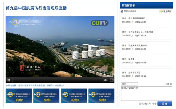 第九届珠海航展,精彩纷呈;珠海网络电视台针对航展进行了全方位的新媒体报道,从航展资讯报道到手机拍客大赛,特别是在国内新媒体领域首次网络应用的多角度直播,网友可以自行选择现场直播视图,想看什么自己做主。tidemedia在整个报道中从发布系统到多视角视频直播应用管理等给予了全程支持;珠海电视台与tidemedia在今年6月份签署了战略合作伙伴协议,双方合作更深入,更具有创新特点,双方在新媒体领域发挥各自优势,逐步打造符合网络特点的新媒体应用产品。