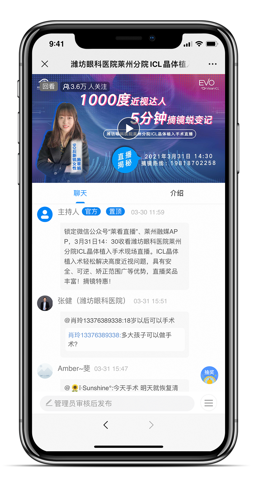医师普及健康知识的同时,支持在线问诊,直播画面实时传输,保障流畅效果,人工+AI双重评论审核机制,维护良好的直播交流环境。