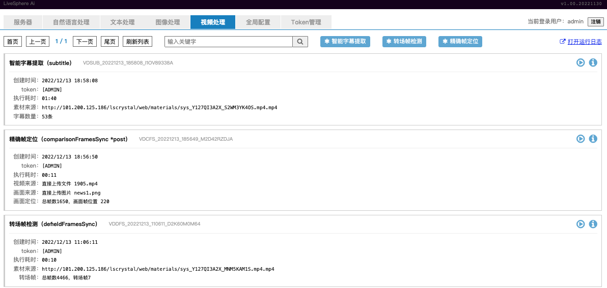 支持智能字幕提取,将视频内容中的人声对话进行文本化提取,并按照时间点形成字幕数据,可用于智能内容非编处理;支持转场帧检测,提取视频中转场转折画面位置,快速定位画面位置,可用于智能内容管理快速检索;支持精确帧定位,根据特征画面,在视频中查找画面的精确位置,快速定位画面位置,可用于智能内容管理及自动化内容管理;支持人脸检测,将视频画面中的人脸进行位置及画面提取,并可进一步进行人脸对比,可用于智能内容检索管理。