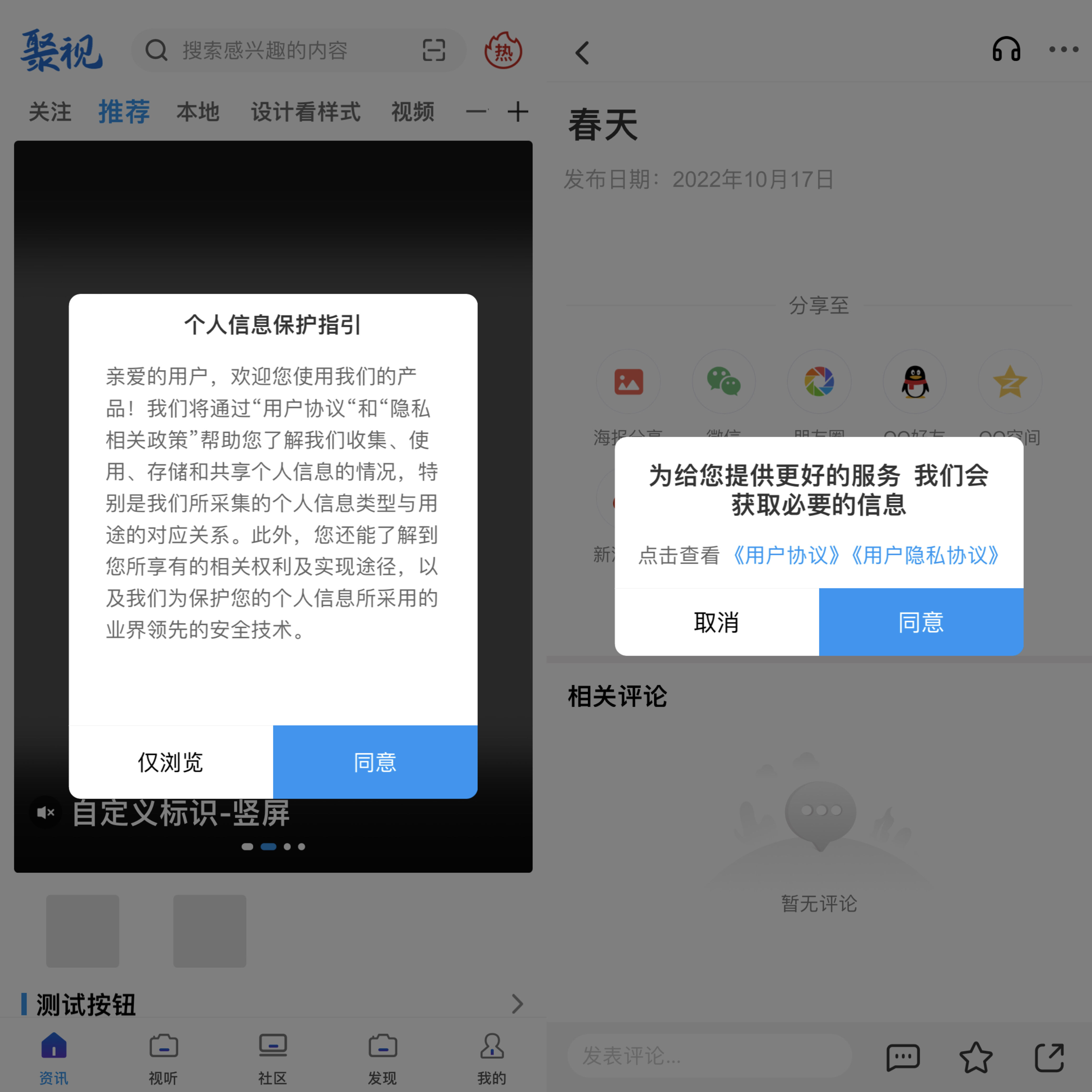 点击"仅浏览" 按钮进入APP,可正常浏览内容;点击交互相关操作,直接调起登录注册;点击权限获取调用相关功能,直接调起需要同意隐私协议的弹框,点击同意之后,方可正常使用所有功能。