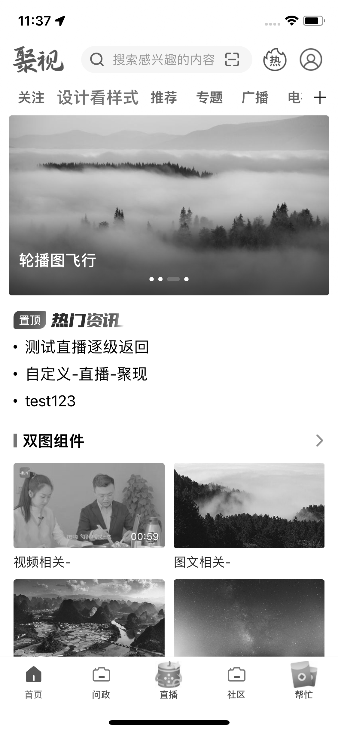 支持轮播图非通栏、横版显示,支持自动/手动切换轮播图;支持关联图文、横版视频。
