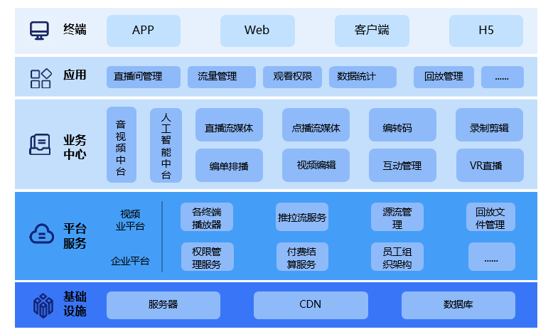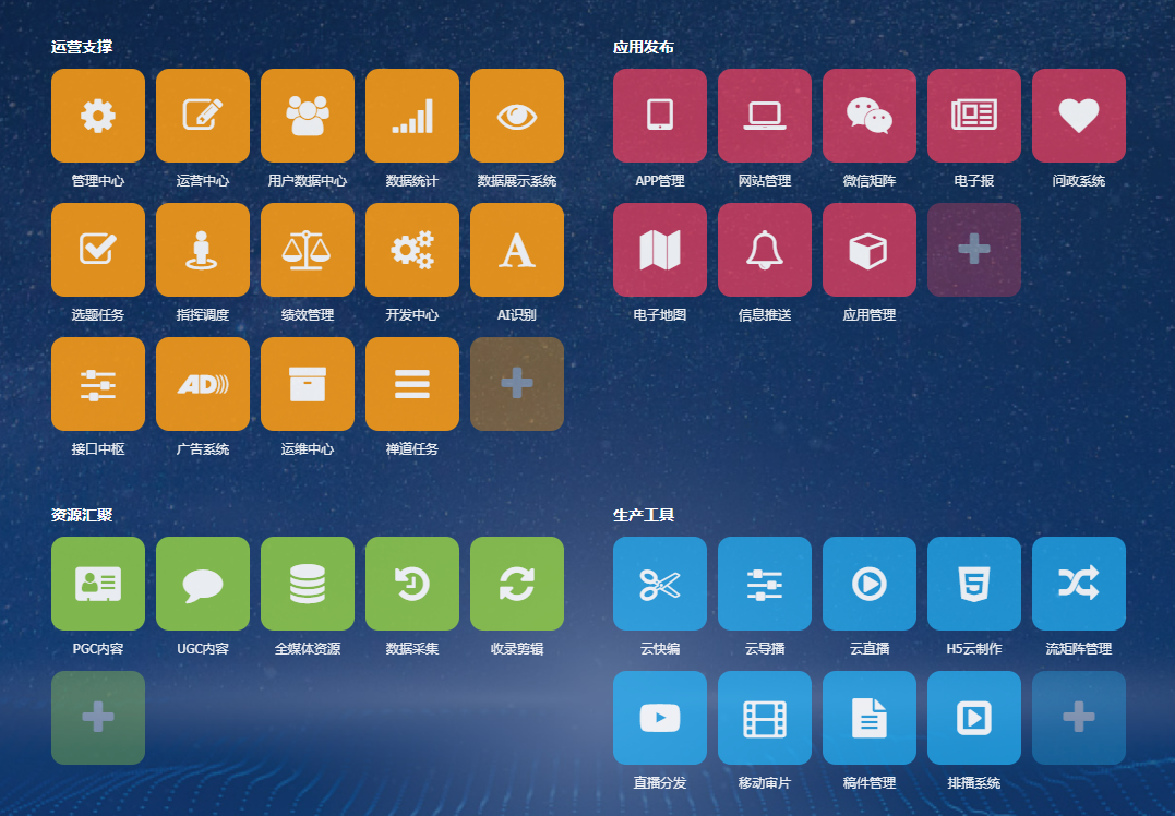 鸿鹄云采用开放云架构,支持公有云+私有云服务业务模式,为媒体用户提供涵盖融合媒体业务的“策、采、编、审、发、运营”全流程业务闭环服务。