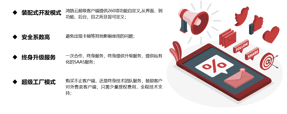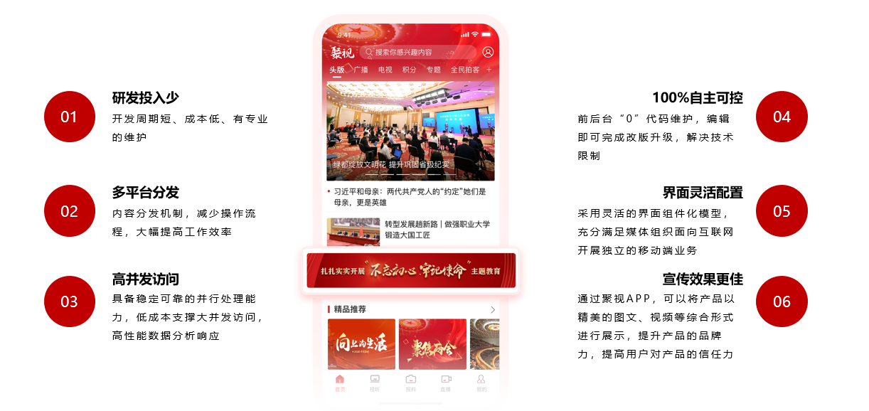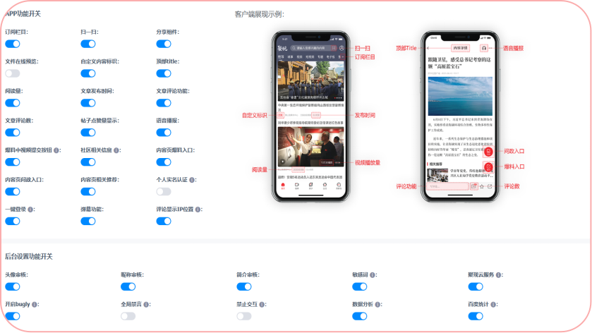 依托鸿鹄云的快速应用开发能力,可以实现媒体应用端网站、APP、小程序的快速生成,所见即所得的界面组织能力与超过200项的控制开关集群,真正实现千端千面。