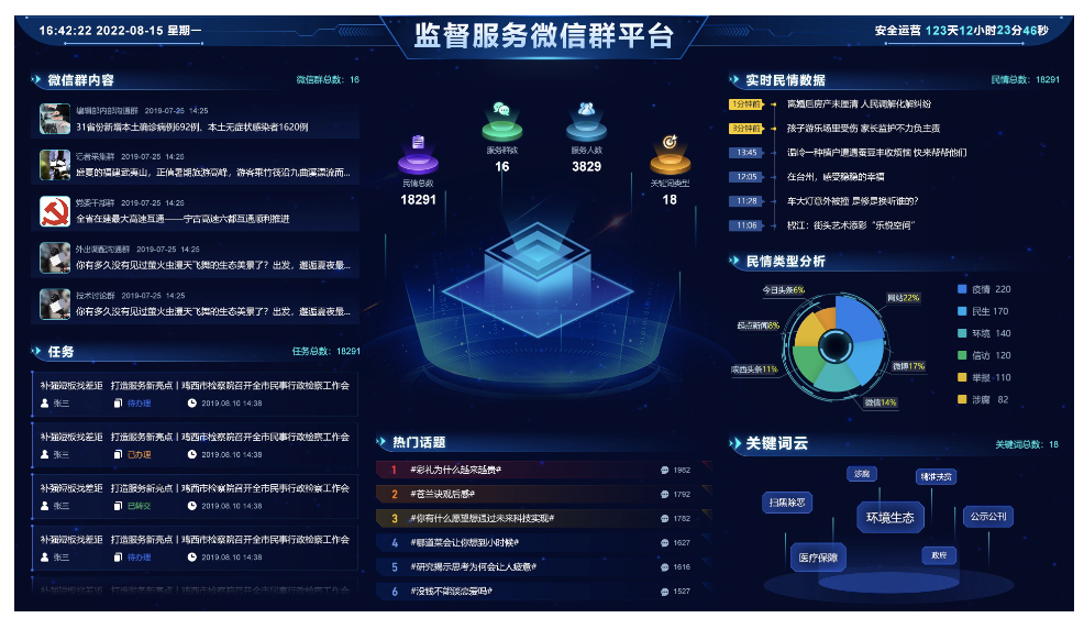 校园舆情监管平台是一款基于大数据分析技术和自然语言处理技术的校园舆情监测系统。该系统提供舆情热点汇聚分析服务和微信群管理监管服务。其中,舆情热点汇聚分析服务支持采集各大热点网站的信息排行,并进行大屏幕呈现。同时,该服务还支持配置监测方案,根据监测方案将舆情信息进行汇聚采集。微信群管理监管服务,能够有效解决传统监督管理盲点,有效将监管前置,实现事前监管。通过结合微信群聊的内容群发、实时群聊检测以及关键词监督分析等多项功能,融合数据可视化以及社群内容管理等组件,使得管理者可以通过聚微进行信息传播、宣传资源调度等多重管理和监控操作,从而实现高效社群运营及管理,信息收集及分析等。