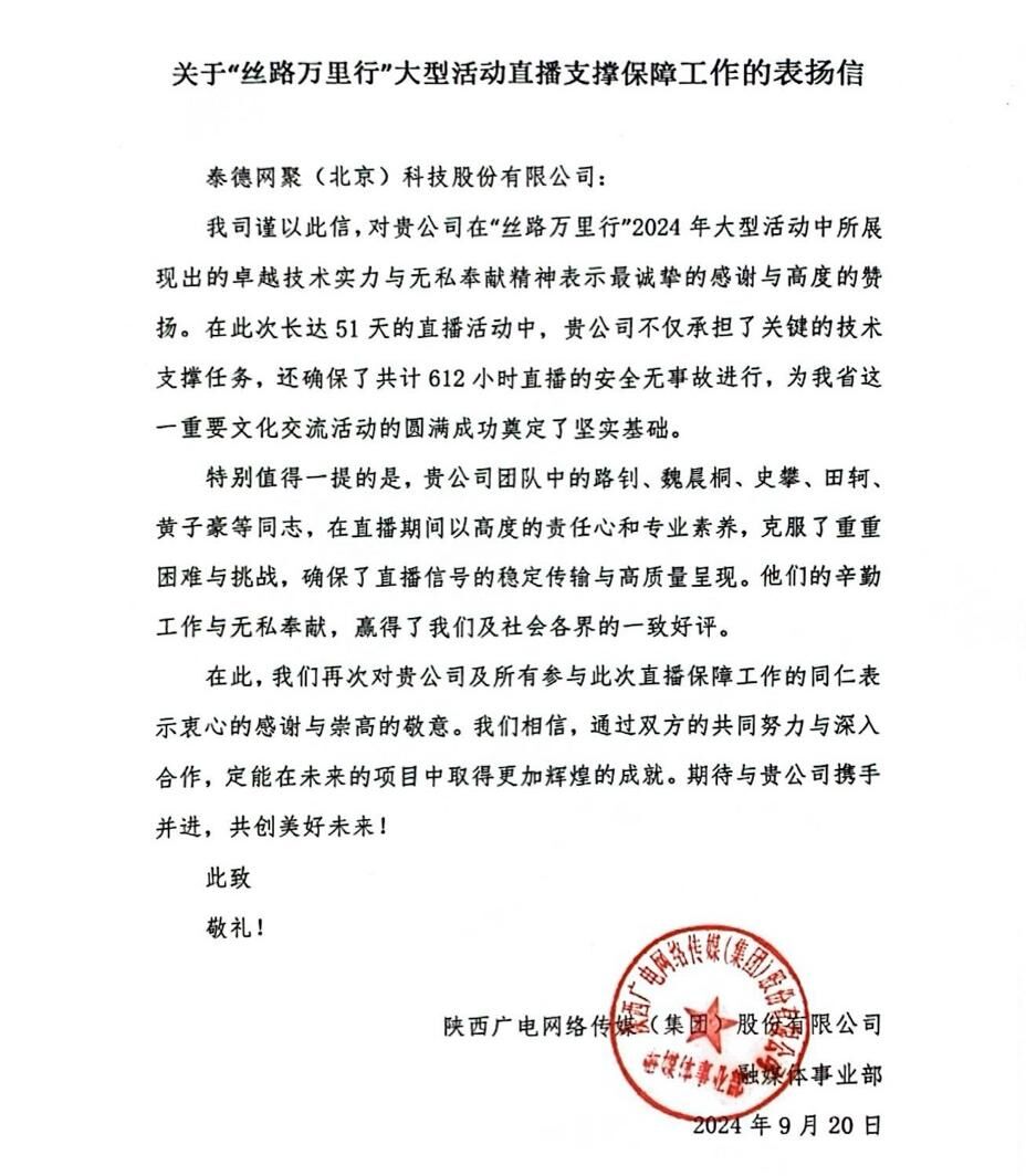 此次长达51天的直播活动,我司负责承担关键的技术支撑任务,我司的技术人员以高度的责任心和专业素养,克服了重重困难与挑战,确保了直播信号的稳定传输与高质量呈现,保障了全程612小时直播的安全无事故进行,不仅为此次重要文化交流活动的圆满成功奠定了坚实基础,并且得到了客户的高度认可与赞扬。